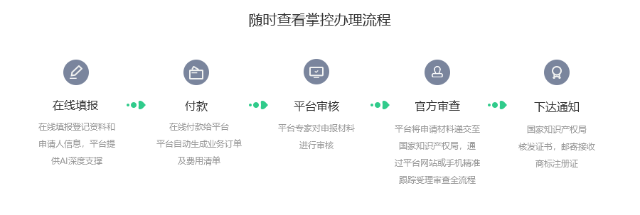 平台对 商标注册 每个业务环节、期限进行即时跟踪提醒,提供邮件、手机通知,随时随地掌握申请进度