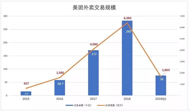 2018年,美团外卖完成63.93亿笔交易,总金额2828亿,同比增长65.3%(2017年同比增速191%)。2019年Q1,美团外卖完成16.63亿笔交易,总金额756亿,同比增长38.6%。