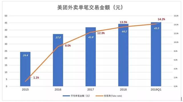 美团外卖平均每单的交易金额呈缓慢上升趋势,2017年41.8元,2018年44.2元,2019年Q1达45.5元。